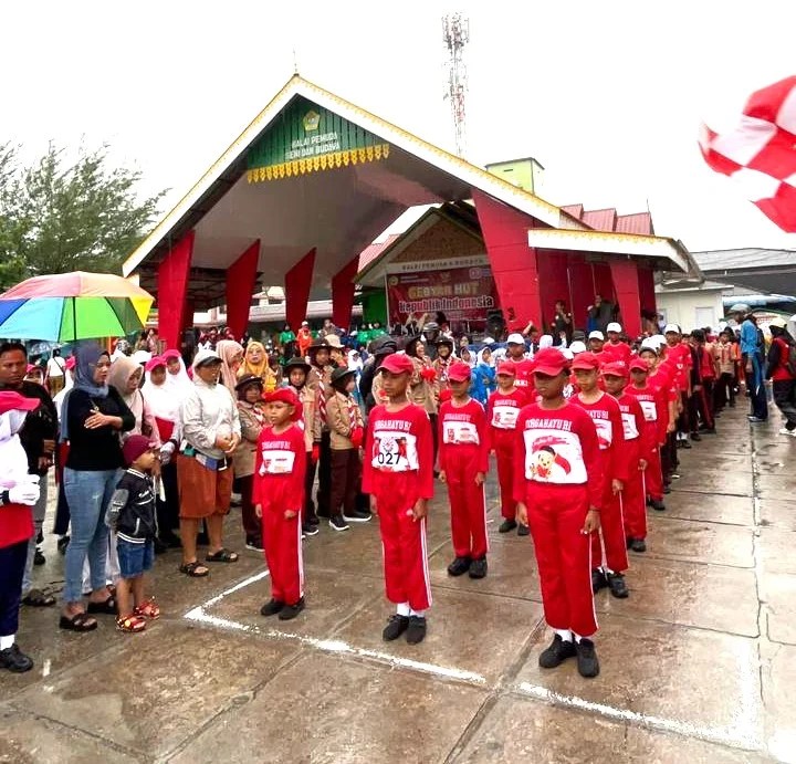 Meski diguyur hujan gerimis, antusiasme para peserta tidak surut sedikit pun. Mereka tetap melangkah penuh semangat, menunjukkan dedikasi dan kecintaan terhadap tanah air. Camat Kundur, H. Sumiram, S.KM., MM., secara langsung melepas keberangkatan para peserta gerak jalan tingkat SD ini.